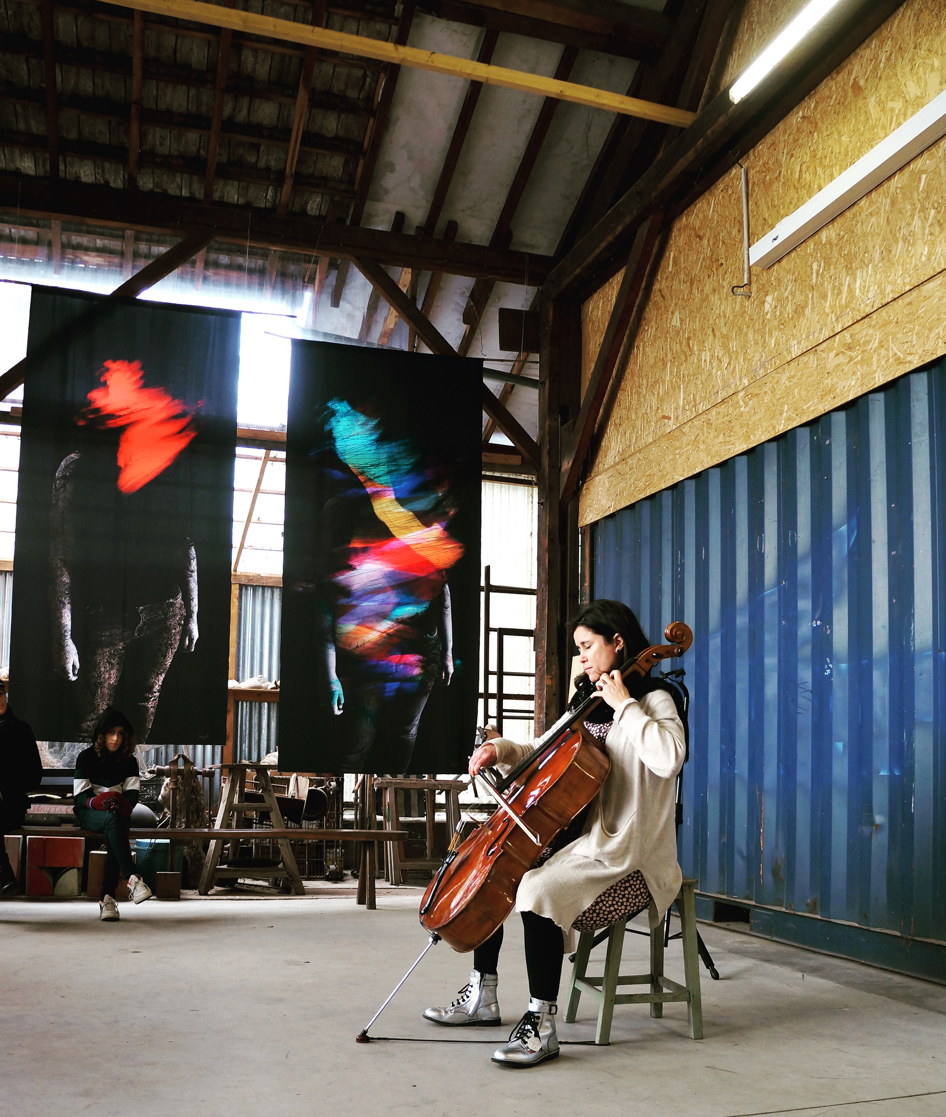 HANGAR 717, lors d’une exposition collective d’artistes. Violoncelliste: Lucie Lacour